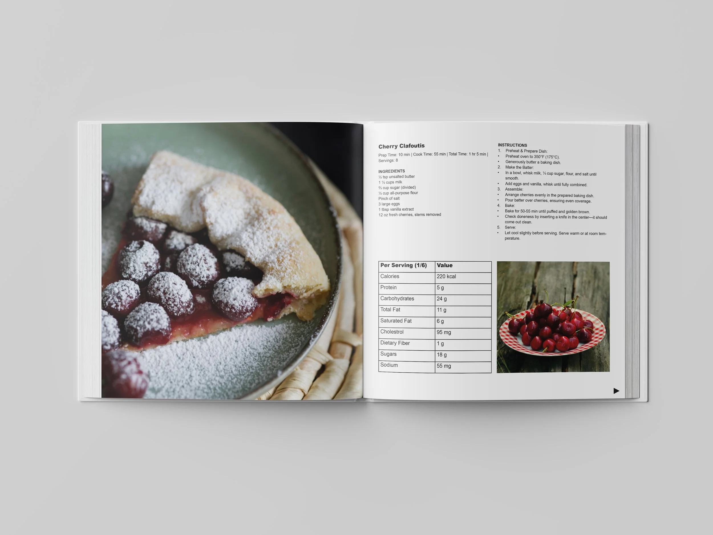 This project focuses on designing an accessible cookbook layout following AODA standards. The goal was to create pages that are easy to read and simple to follow while still feeling visually engaging. The layout combines food photography with clearly structured sections for ingredients, instructions, and nutrition information.