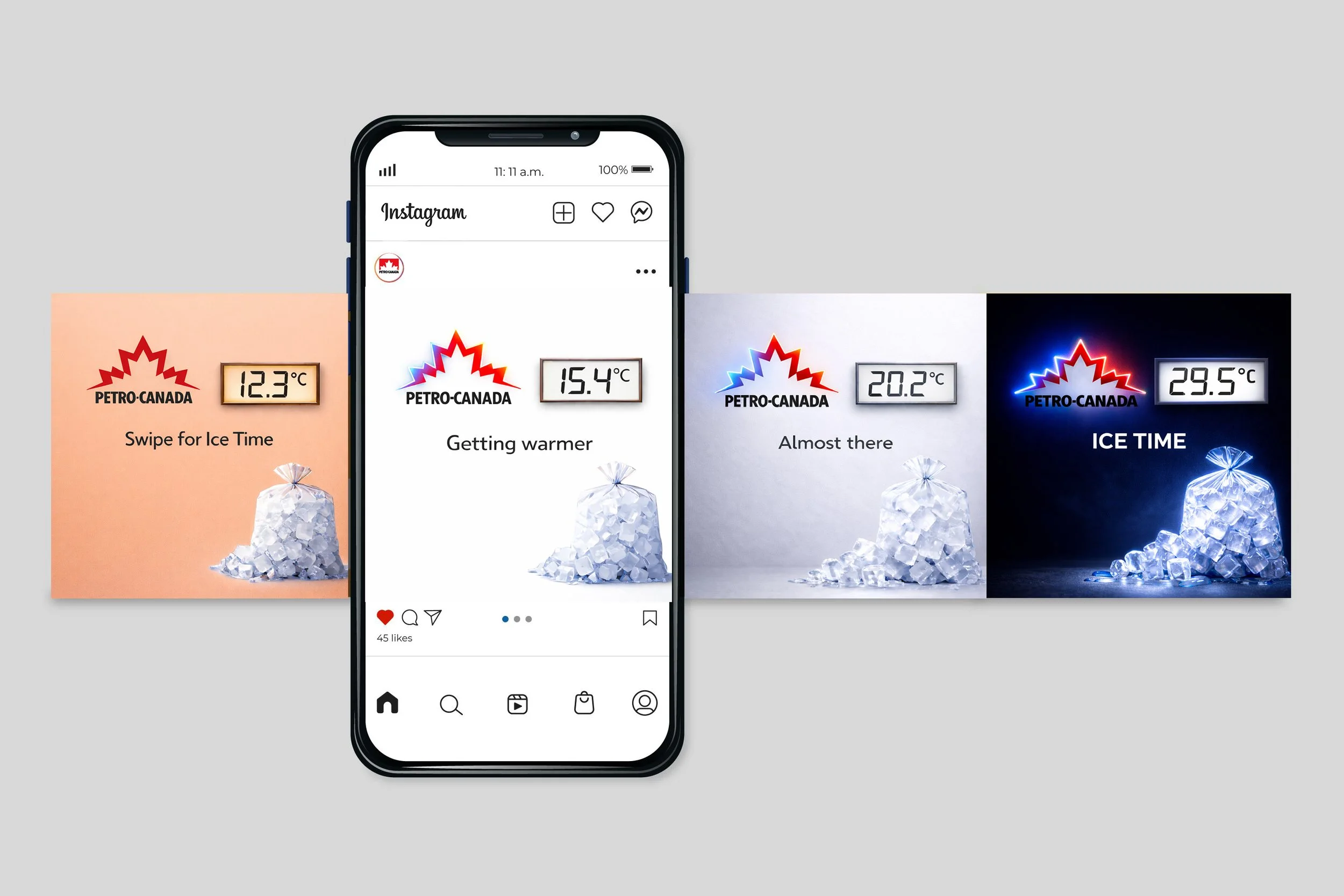 This project was created for Petro-Canada and focuses on one of the brand’s most common purchases: ice. The campaign is built around the maple leaf sign that sits above the ice freezers at Petro-Canada locations. When the temperature rises above 25°C, the maple leaf lights up and signals “Ice Time.”